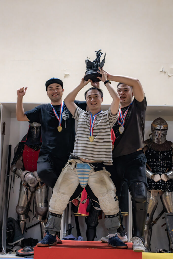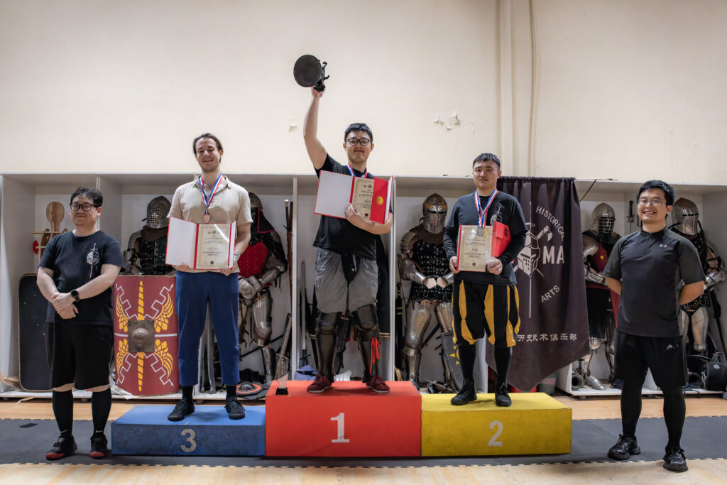 But unlike most clubs, SHMA doesn’t limit itself to Western martial arts. They also train Chinese historical martial arts with weapons like the changdao (Chinese long knife) and daqiang (Chinese spear). This mix of arts also means a fusion of approaches, where the club competes in both HEMA and Chinese arts using the Nordic ruleset. In fact, during the two-day competition, one of the fencers who won no less than three gold medals, Sheng Hongyuan (盛弘源), better known by his nickname Spider (蜘蛛), is a self-taught Chinese martial arts practitioner.