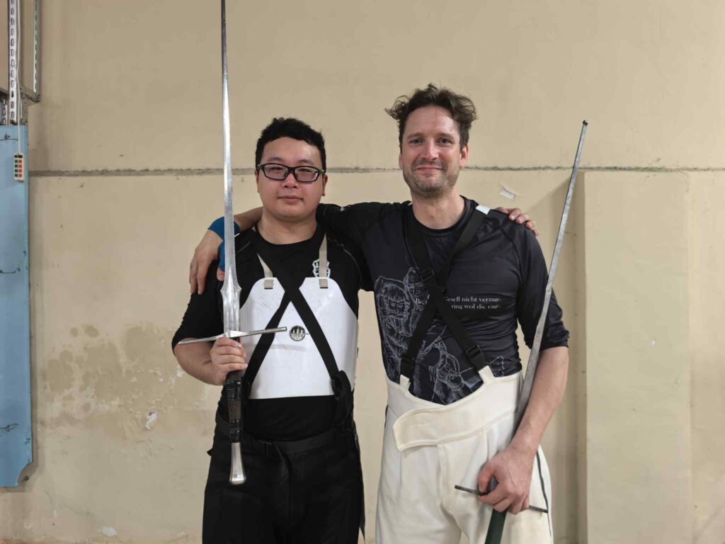 I also had the good fortune to meet up with an old club mate. Before the pandemic, Andrew (徐晓非) chose Sweden for his university studies because he wanted to train with GHFS. It was just at the time when I was leaving the club, so he mainly trained under Kasper Aase, but we did have some interaction since he’s also responsible for translating some of my videos and texts for Chinese audiences. He’s also translating Ringeck to Chinese, the first translation of its kind, I believe. During the event, we had many discussions about the German text and the interpretations as a result.