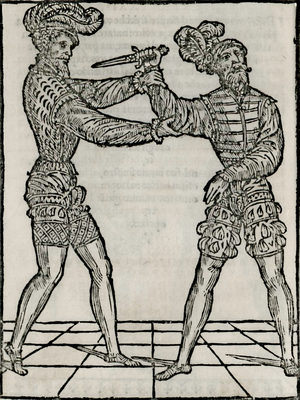 The insult burned deeper than the punishment. When a cousin refused to stand bail for him, Cellini describes himself as “turning wholly to evil.” He ran to his shop, seized a dagger—a pugnale (the same term is used for a dagger by Marozzo)—and stormed the Guasconti household, where the family were eating together. He stabbed Gherardo in the chest, driving the weapon through doublet and jerkin. “I felt my hand go in, and heard the clothes tear,” he writes, believing he had killed him.